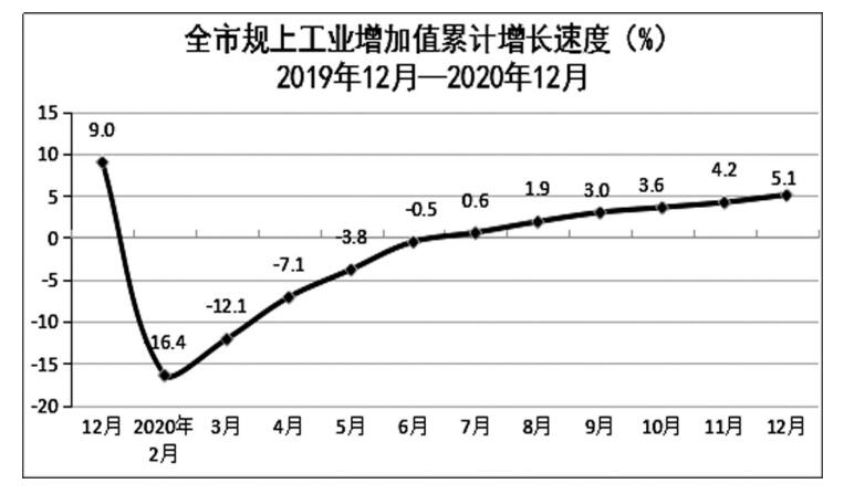 1—12月,全市规模以上工业增加值同比增长5.1%;其中,大中型企业增长20.2%,非公有制企业增长5.6%,高技术企业下降54.2%。从门类看,采矿业增长7.2%,制造业增长4.6%,电力、热力、燃气及水生产和供应业下降4.5%;从轻重工业看,轻工业下降29.9%,重工业增长6.5%。