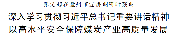 4月27日,市委书记张定超到盘州市宣讲习近平总书记在贵州考察时的重要讲话精神,调研督导煤矿安全生产工作。他强调,要深刻感悟习近平总书记关怀厚爱和殷切嘱托,更好统筹发展和安全,落细落实煤矿安全各项措施,以高水平安全保障煤炭产业高质量发展,在中国式现代化进程中展现六盘水新风采。